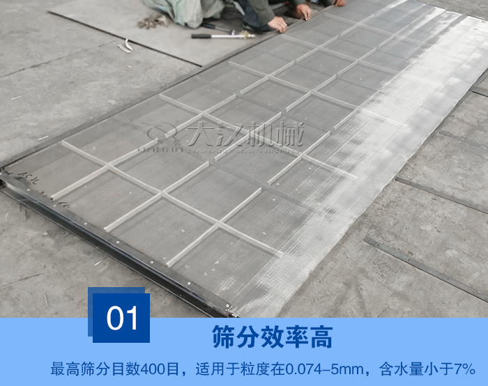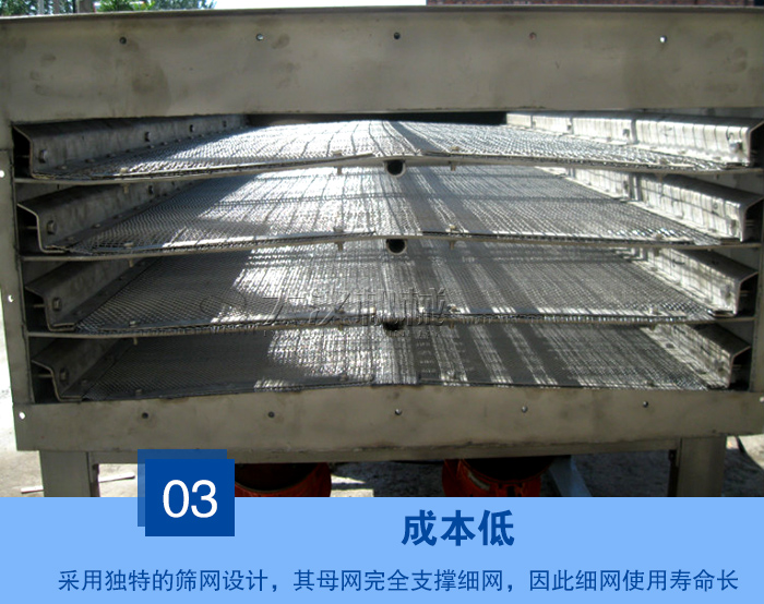 作為為常見的一種振動篩,采用獨(dú)特的篩網(wǎng)設(shè)計(jì),其母網(wǎng)完全支撐細(xì)網(wǎng),因此細(xì)網(wǎng)使用壽命長,降低了細(xì)網(wǎng)的耗材使用,長時(shí)間的生產(chǎn)可降低諸多成本,方便和快速更換篩網(wǎng) 。