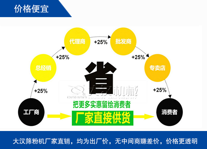 大漢篩粉機廠家直銷,均為出廠價,無中間商賺差價,價格更透明,而且我們公司位于河南省新鄉市,設備的生產成本和運輸成本普遍較低,所以可以節省大量的資金浪費,篩粉機價格更便宜。